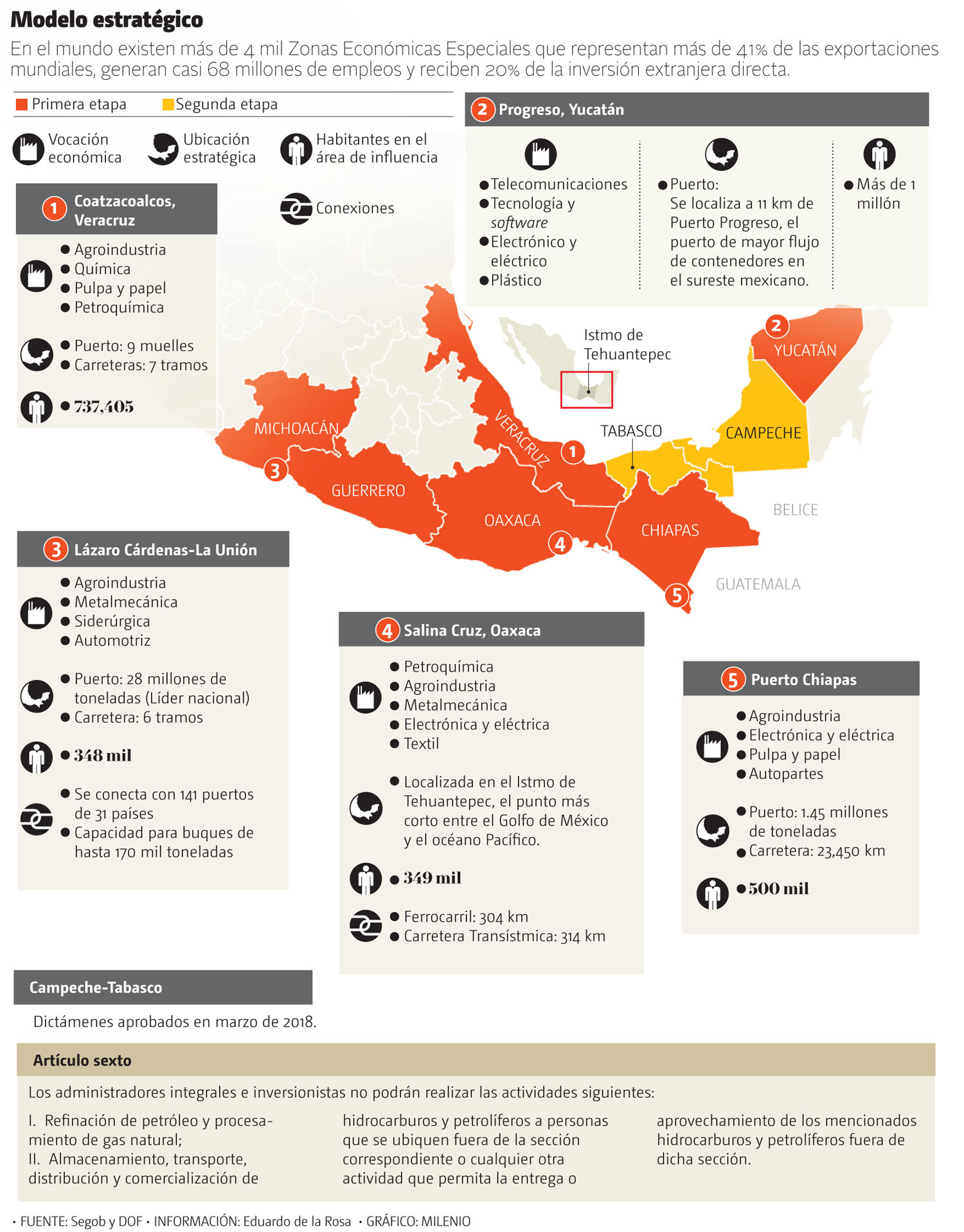 De acuerdo con lo publicado en el Diario Oficial de la Federación, “las actividades de refinación de petróleo y procesamiento de gas natural, así como el almacenamiento, el transporte, la distribución y la comercialización de hidrocarburos y petrolíferos, que se aprovechen fuera de la sección correspondiente, ya están siendo impulsadas a través de los instrumentos previstos en la reforma energética, por lo que no es pertinente que dichas actividades se desarrollen en las secciones de la Zona Económica Especial” de Campeche y Tabasco, respectivamente.