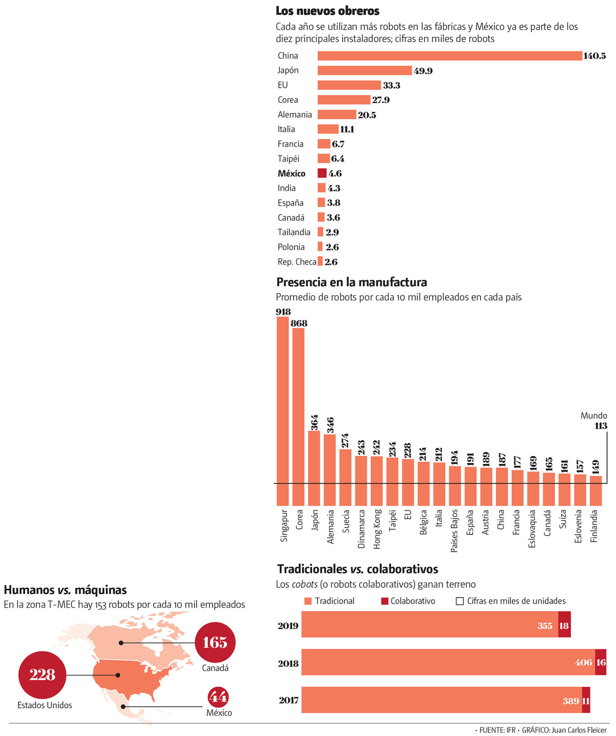 En la industria manufacturera, según el reporte de IFR, en América del Norte hay en promedio 153 robots por 10 mil empleados. En Estados Unidos el promedio es de 228 robots por 10 mil empleados, en Canadá 165 robots por 10 mil empleados y en México solo 44 robots por 10 mil empleados.