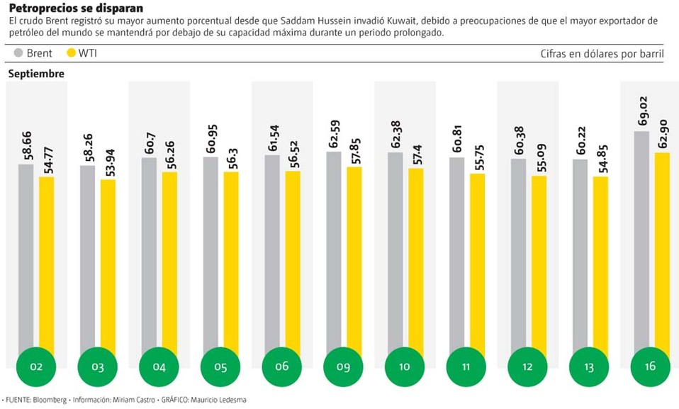 Los precios del petróleo registraron ayer su mayor incremento desde 1991, luego de los ataques con drones del fin de semana a instalaciones petroleras en Arabia Saudita, el mayor exportador de crudo a escala mundial y que interrumpieron 5 por ciento de los suministros mundiales.