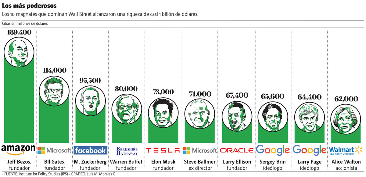 Los 12 multimillonarios más relevantes de Wall Street, que incluyen a los fundadores de Amazon, Jeff Bezos; Microsoft, Bill Gates, y Facebook, Mark Zuckerberg, han alcanzado por primera vez en la historia una riqueza combinada de 13 cifras, es decir, más de un billón de dólares de patrimonio y 40 por ciento más que cuando comenzó la pandemia.