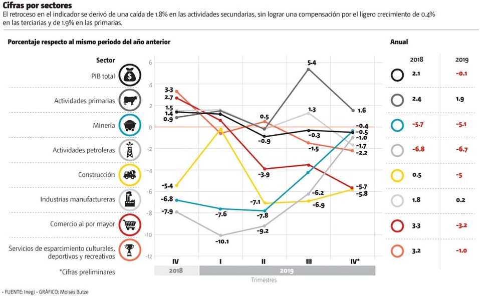 En 2019 la economía mexicana registró una caída de 0.1 por ciento respecto a 2018, de acuerdo con el Inegi, siendo el primer retroceso en diez años, momento álgido de la crisis financiera mundial.