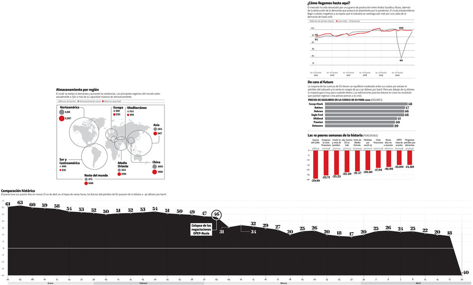 A partir del 1 de mayo, por el pacto OPEP+ se recortará la producción diaria en 9.7 millones de barriles, que se sumará a la causada directamente por efecto del covid-19 estimada en otros 10 millones de barriles. La EIA estima que la demanda de crudo este mes podría ser de 19 millones de barriles diarios menos que hace un año, un nivel no visto desde 1995, mientras que la Agencia Internacional de Energía la dimensiona en 29 millones.