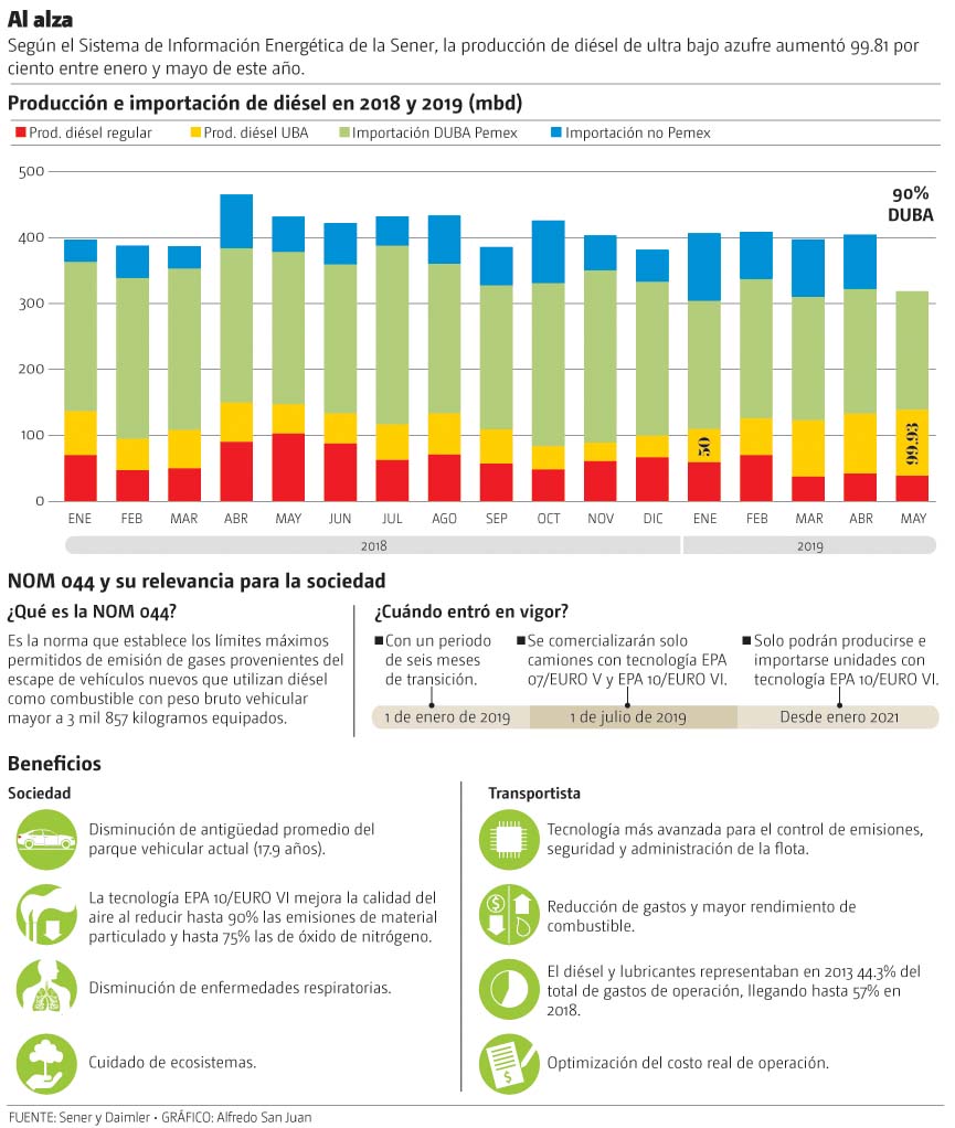 La industria de vehículos pesados y la automotriz insisten en la necesidad de contar con diésel de ultra bajo azufre (DUBA) a escala nacional para que entre en vigor sin restricciones la NOM 044, una regla que aplica desde el pasado 1 de julio sin contar con este combustible en todo el país, cuyas existencias están pendientes desde hace 10 años tras la promesa de Pemex de abastecerlo.
