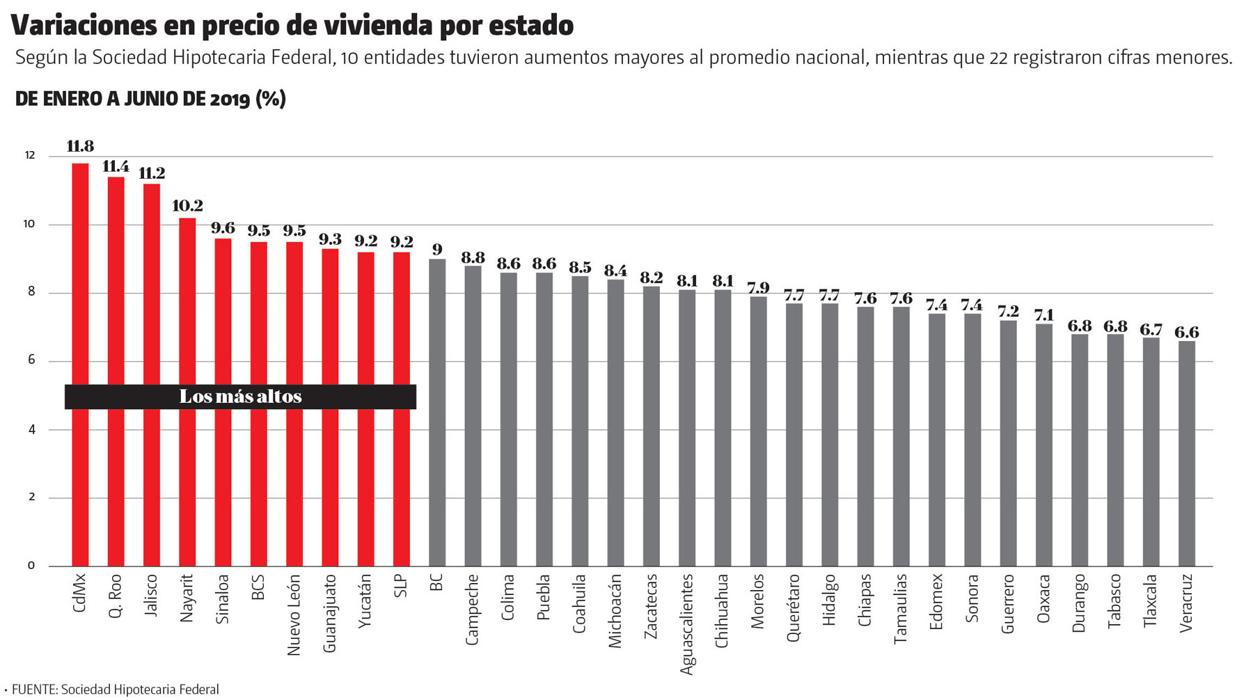De acuerdo con el Índice SHF y por entidades, de enero a junio pasados los costos de las viviendas aumentaron en Ciudad de México 11.8 por ciento; en Quintana Roo, 11.4, y en Jalisco, 11.2 por ciento, si se comparan con los mismos meses del año pasado.