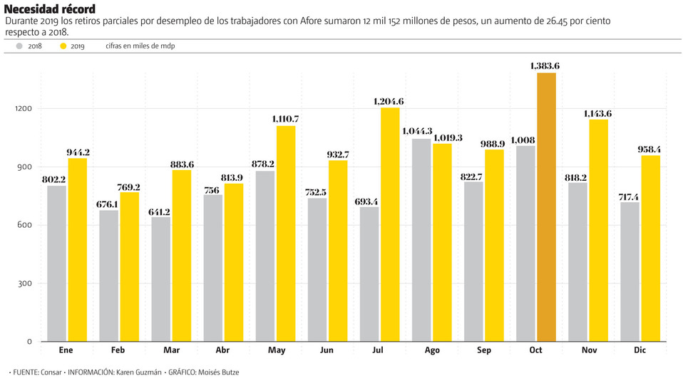 Durante 2019, los retiros parciales por desempleo de los trabajadores con una cuenta de Afore sumaron 12 mil 152 millones de pesos, lo que representa un aumento de 26.45 por ciento en comparación con 2018, informó la Comisión Nacional del Sistema de Ahorro para el Retiro. De acuerdo con las cifras actualizadas del organismo, se trata de la cifra más alta registrada para un periodo, superando por 2 mil 542 millones de pesos a lo que se retiró durante 2018.