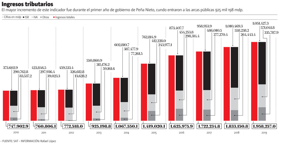 El mayor incremento en los ingresos tributarios se presentó durante el sexenio de Enrique Peña Nieto, pues en su primer año de gobierno entraron a las arcas públicas 925 mil 198 millones de pesos. Para 2018, el último año de su administración, dicha cifra ya se había duplicado.