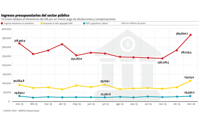 En enero de 2020 los ingresos federales fueron superiores a lo estimado, gracias a una mayor recaudación del impuesto al valor agregado (IVA) y del impuesto especial sobre producción y servicios (IEPS); sin embargo, el gasto público inició el año con un subejercicio, al estar por debajo de lo programado.