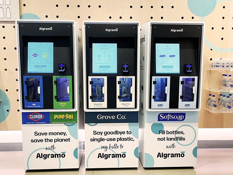 El sistema de Algramo pone a disposición envases inteligentes que rastrean el ciclo de vida del plástico y una plataforma en el supermercado para rellenar productos para el hogar, como detergentes, champús, alimentos secos o alimentos para mascotas.