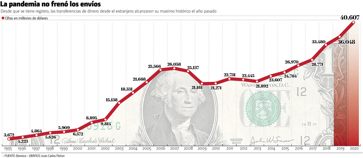 México recibió 40 mil 606.7 mdd de sus ciudadanos residentes en el extranjero en 2020, un aumento de 11.4 % respecto a los 36 mil 438 mdd de 2019, lo que lleva al país a registrar un nuevo máximo histórico pese a la pandemia, informó el Banco de México.