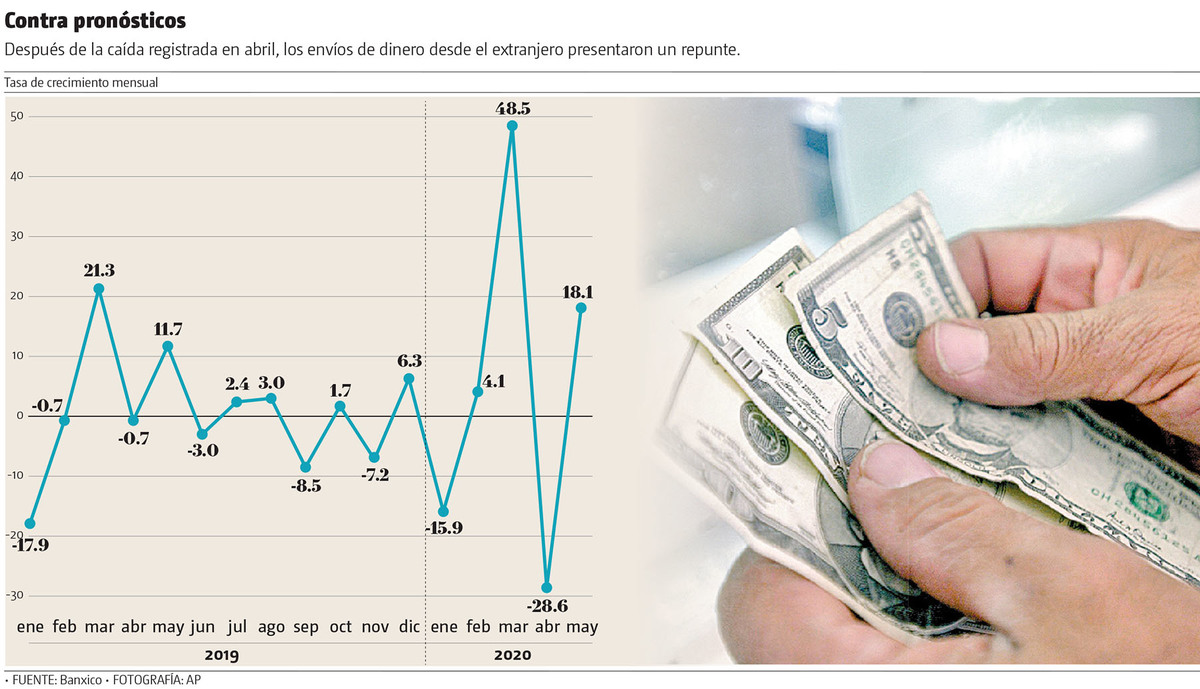 Tanto para los analistas de Banorte como para los de Banco Base, el aumento en el flujo de dinero también pudo ser por los programas temporales de empleo impuestos por el gobierno estadunidense para hacer frente a la emergencia sanitaria y también los del inicio de temporada como los del sector agrícola.