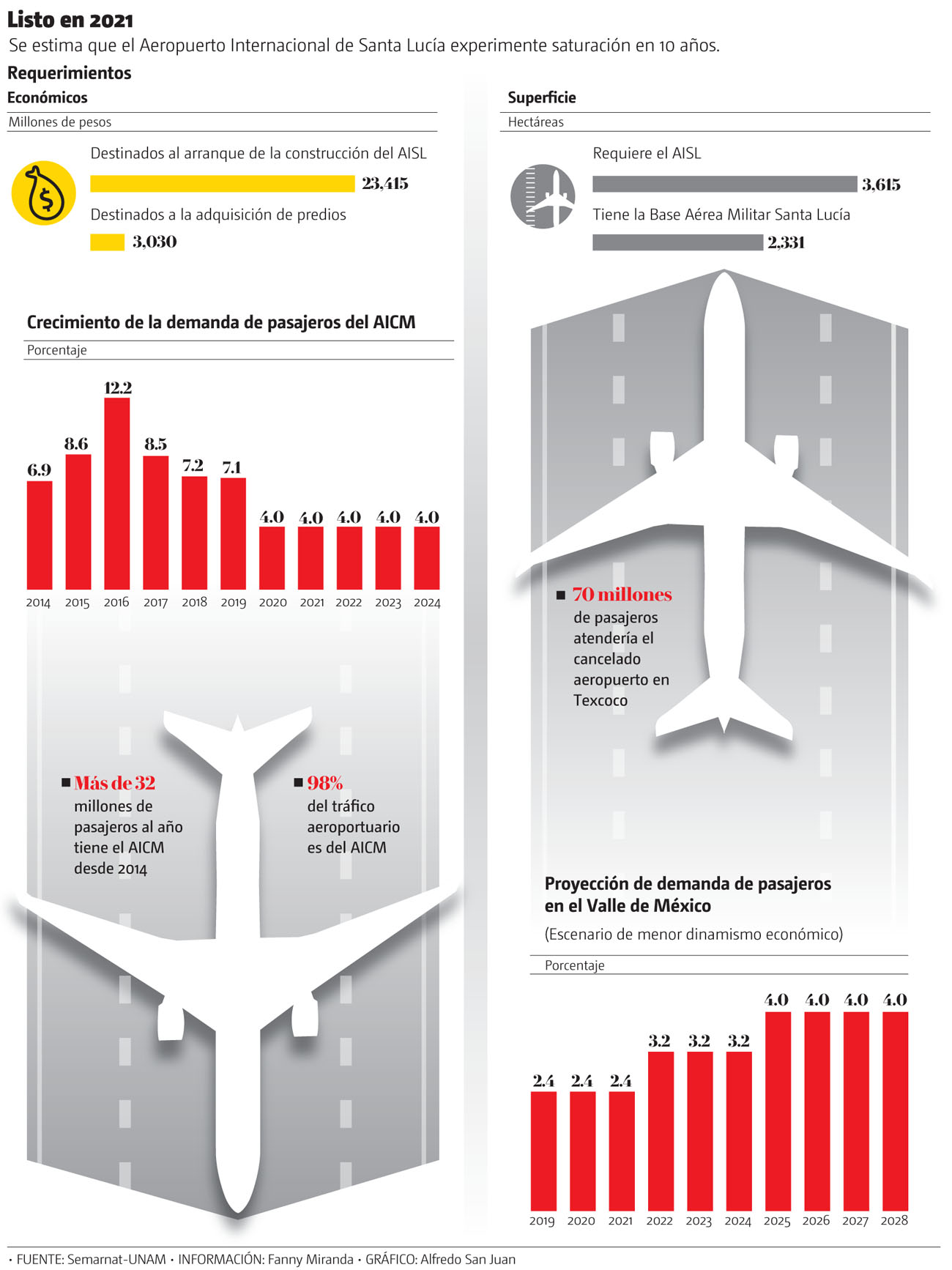 La construcción del aeropuerto de Santa Lucía se justifica en la saturación del AICM desde 2014, cuya capacidad se rebasa con 32 millones de pasajeros al año, por lo que la Secretaría de Comunicaciones y Transportes (SCT) impulsa el “Sistema Aeroportuario Metropolitano” para redistribuir el tráfico aéreo entre los aeropuertos capitalino, de Toluca y Santa Lucía, como alternativa a la cancelación del Nuevo Aeropuerto Internacional de México (NAIM), que tenía una capacidad proyectada de 70 millones de pasajeros en su primera fase.