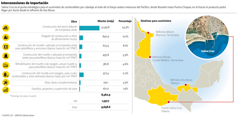 La SCT explica que con el incremento de la producción petrolera, así como el suministro de combustibles de las refinerías de Salina Cruz, de Minatitlán y en el futuro Dos Bocas, la operación del sistema actual de carga-descarga tendrá que ampliarse significativamente.