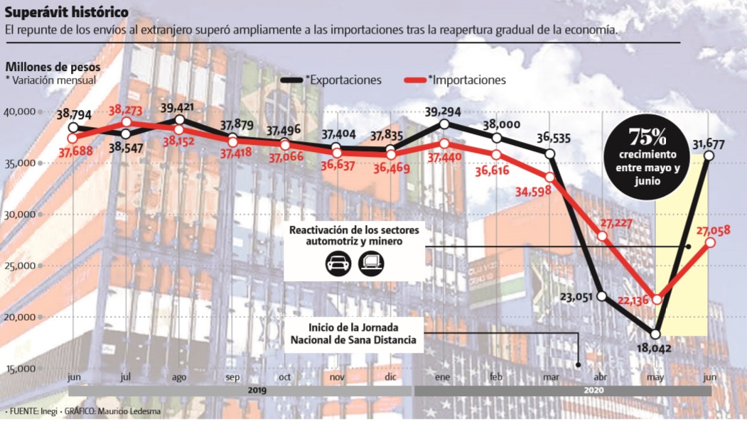 Para analistas de Monex, el superávit se dio tras el confinamiento y, por mucho, es el mayor de todo el registro histórico. Banco Base indicó que éste se da por una mayor recuperación de la demanda externa sobre la interna. Sin embargo, para Monex la cifra acumulada del primer semestre refleja el dispar comportamiento de exportaciones e importaciones, por lo que la reactivación del comercio global es parcial.