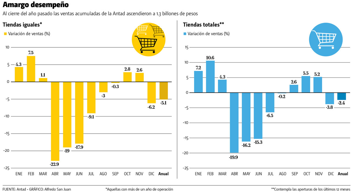 En general, la crisis de salud en 2020 afectó las ventas de todos los integrantes de la Antad y éstas cayeron 5.1 por ciento a tiendas iguales (aquellas con más de un año de operación) en comparación con 2019, mientras que las ventas a tiendas totales (incluyen aperturas de los últimos 12 meses) bajaron 2.4 por ciento.