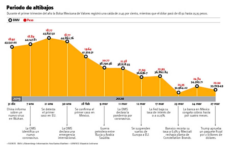 Del cierre de diciembre de 2019 al 30 de marzo de 2020, el Índice de Precios y Cotizaciones (S&P/BMV IPC) de la Bolsa Mexicana de Valores (BMV) registró una caída de 21.45 por ciento; en tanto, el tipo de cambio acumula una depreciación de 5 pesos con 24 centavos, al pasar de 18.88 a 24.12 pesos por dólar. Cifras del Banco de México indican que en sucursales bancarias se vende hasta en 25.50 pesos por billete verde.
