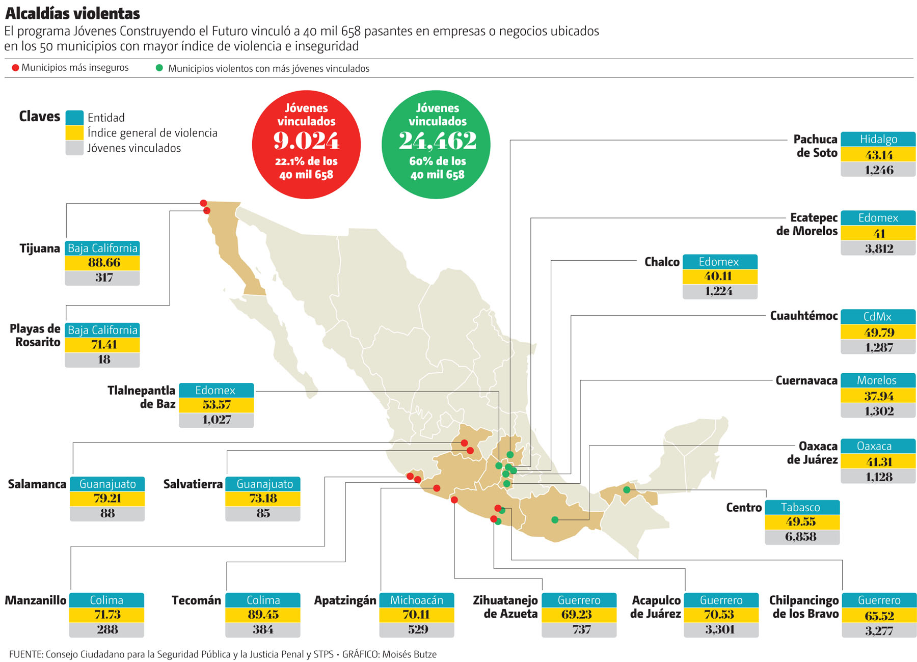 Hasta ahora únicamente 11.8 por ciento de las 343 mil personas vinculadas al programa Jóvenes Construyendo el Futuro vive en los 50 municipios más peligrosos del país, de acuerdo con un cruce de datos hecho por MILENIO entre las cifras que publica la Secretaría de Trabajo en su página web y el Índice de Violencia Municipal del Consejo Ciudadano para la Seguridad Pública.