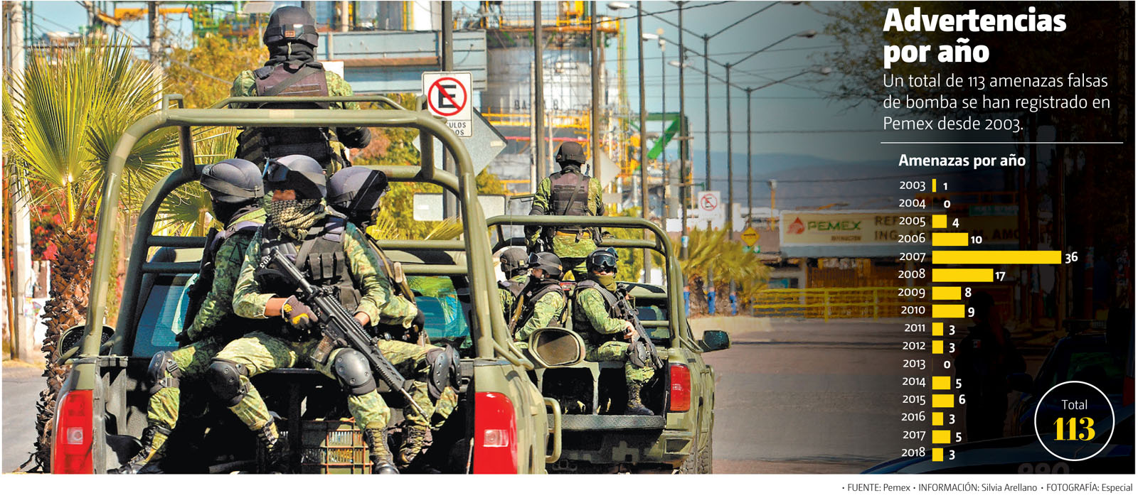 De 2000 a 2018 Petróleos Mexicanos (Pemex) recibió 113 amenazas de bombas y todas fueron falsas. Sin embargo, por protocolo, en todos los eventos fue necesario desalojar el inmueble correspondiente. El mayor número se registró durante el primer año de gobierno del presidente panista Felipe Calderón, en 2007, con 36.