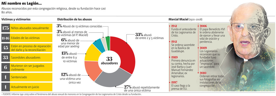 Los Legionarios de Cristo admitieron que 175 menores de edad fueron víctimas de abusos sexuales cometidos por integrantes de su congregación: 33 sacerdotes, entre quienes se encuentra su fundador, Marcial Maciel, con 60 casos.