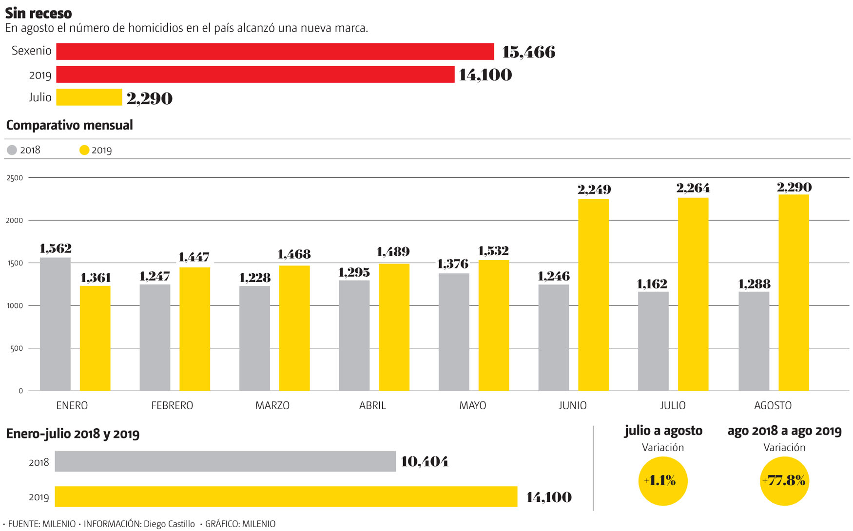 Comparado con agosto de 2018 (mil 288) el número de ejecuciones se elevó en 77.8 por ciento, lo que en cifras representa más de mil casos en el mismo periodo.