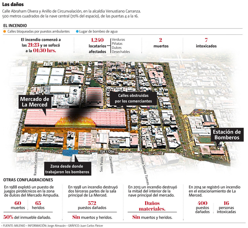Los puestos semifijos que se extienden entre Anillo de Circunvalación y Cabaña impidieron que el Heroico Cuerpo de Bomberos actuara con mayor rapidez ante el incendio en la Nave Central de La Merced, el cual dejó un saldo de dos muertos, siete intoxicados y daños en mil 240 locales.