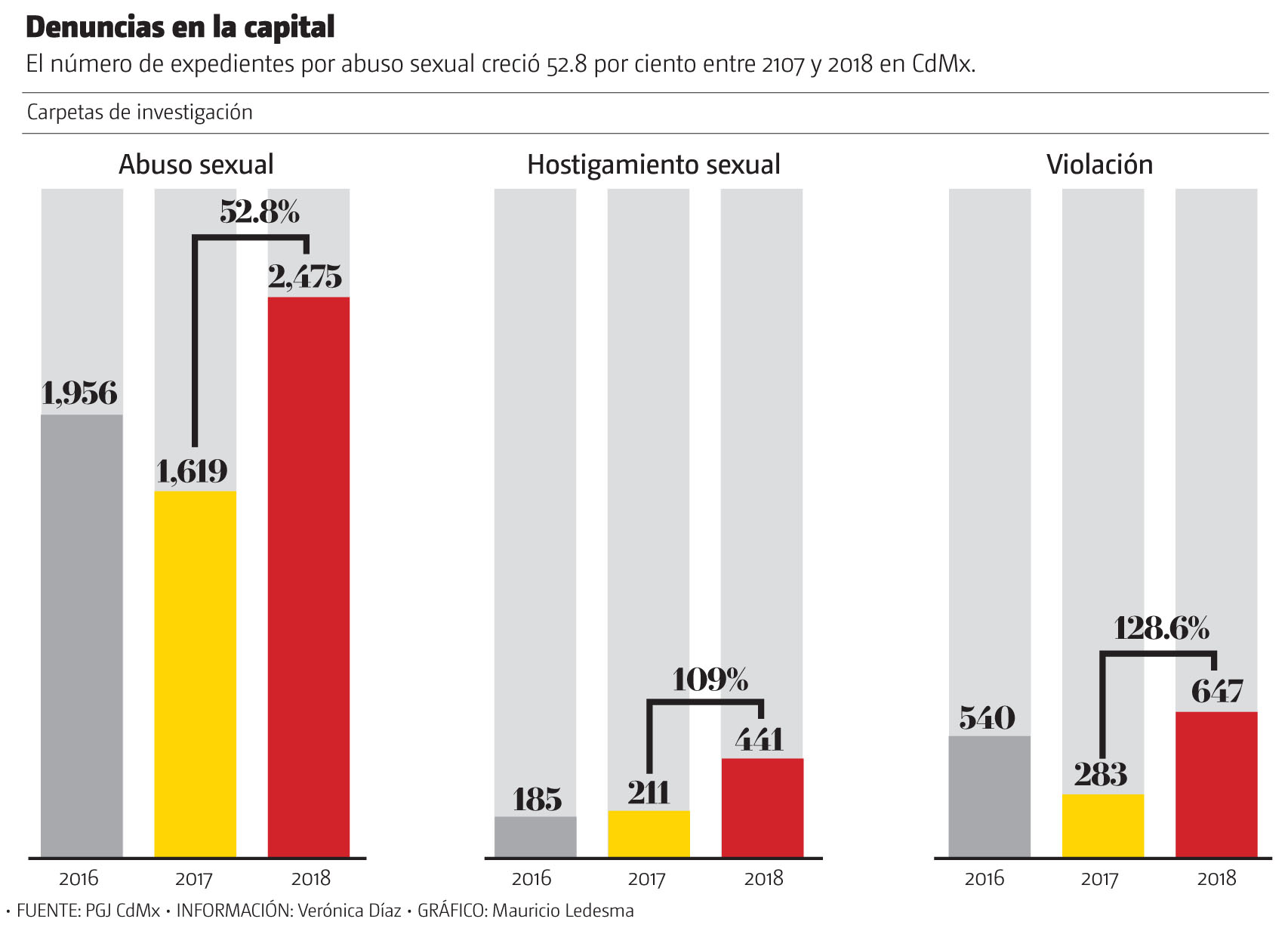 Según el portal de datos para concentrar los delitos denunciados, en 2016 hubo 2 mil 681 agresiones contra mujeres; en 2017, 2 mil 113, mientras que en 2018 aumentó a 3 mil 563. La cifra suma tres tipos de ilícitos: violación, abuso y hostigamiento.