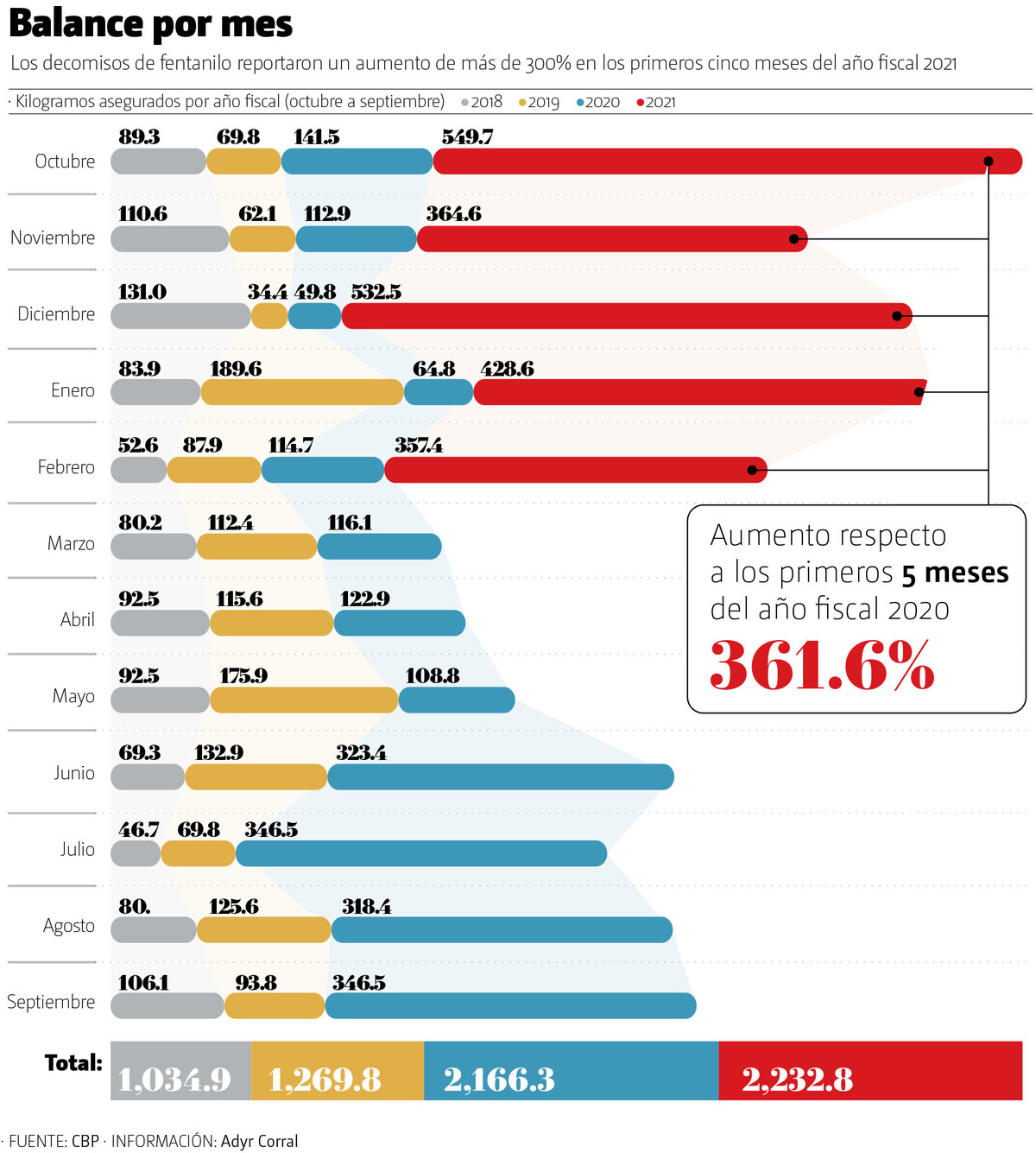 Pasó de 483 kilogramos incautados en 2020 a 2.2 toneladas en 2021; los decomisos de fentanilo en lo que va del año fiscal 2021, que inició en octubre, son mayores que el total anual de 2020: en cinco meses, las 2.2 toneladas decomisadas rebasaron las 2.1 toneladas de los 12 meses anteriores.