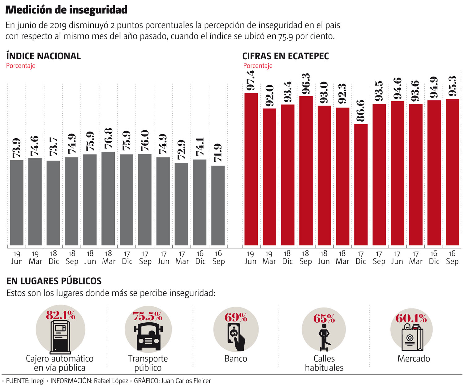 De acuerdo con la Encuesta Nacional de Seguridad Pública Urbana que realiza cada trimestre el Instituto Nacional de Estadística y Geografía (Inegi), en junio pasado disminuyó 2 puntos porcentuales la percepción de inseguridad en el país con respecto al mismo mes de 2018, cuando el índice se ubicó en 75.9 por ciento.