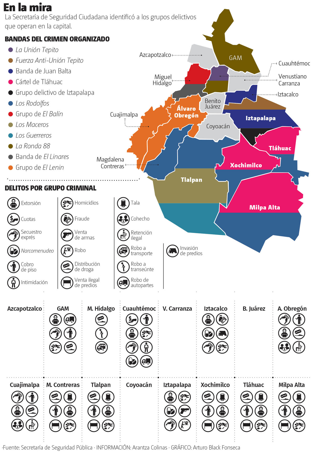 Por su parte, el secretario de Seguridad, Omar García Harfuch, explicó que son los principales grupos generadores de violencia en CdMx, mientras que aquellos considerados en proceso de desarticulación son La Unión Tepito, Fuerza Anti Unión Tepito, Cártel de Tláhuac y la célula de El Preciso, quien fue capturado el jueves pasado en la alcaldía Benito Juárez.