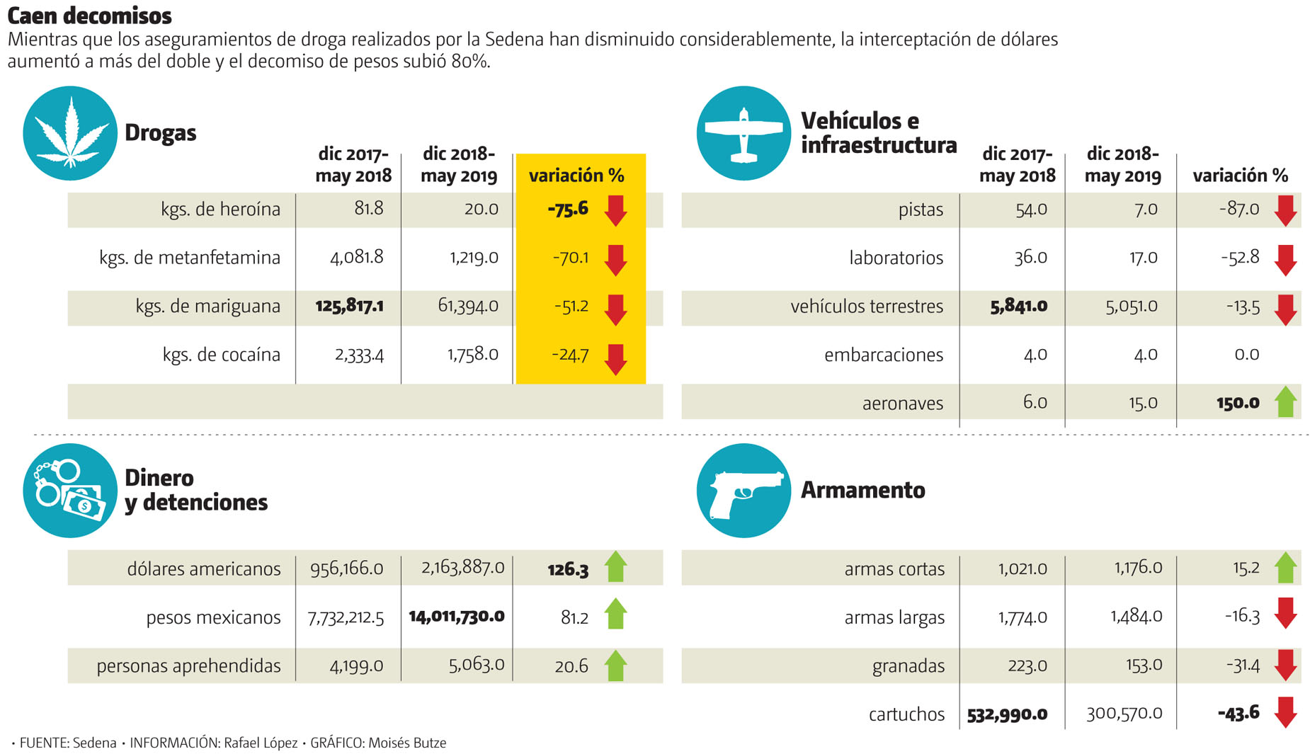 A pesar de dichas declaraciones y de los bajos niveles de aseguramiento de droga, la Sedena ha elevado el decomiso de dinero en efectivo y las detenciones presuntos criminales.