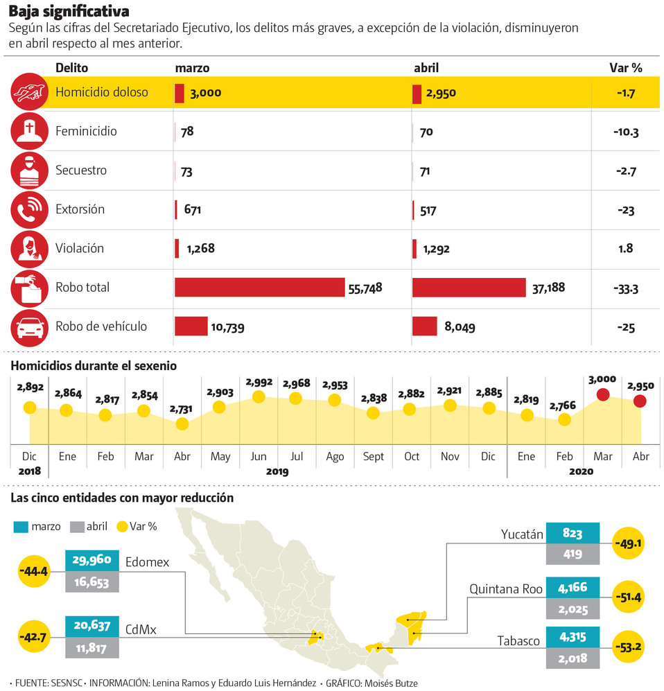 Las cifras del Secretariado muestran una tendencia a la baja en varios delitos; entre los más notorios están los de índole sexual, cuyo récord histórico de 5 mil 239 denuncias impuesto en marzo cayó a 3 mil 172 en abril. Las fiscalías del país contabilizaron el mes pasado 111 mil 547 ilícitos, 57 mil 279 menos que en marzo; la cifra es la más baja desde enero de 2004, cuando se consignaron 108 mil 107 delitos. Hubo 70 feminicidios, una caída de 10.3 por ciento respecto al mes anterior; abril fue el mes con menos víctimas de género durante 2020.