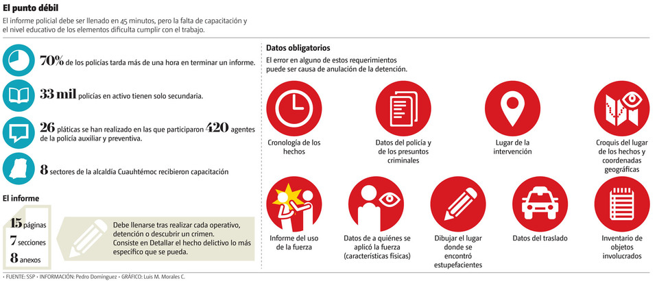 Este documento que se ha convertido en el punto débil de la labor policial, debe llenarlo el primer elemento que llegue a una escena del crimen. Sin embargo, algo que debería ser un mero trámite se convierte en un dolor de cabeza para los uniformados ante una falta de capacitación, el bajo nivel educativo que tienen y hasta las horas de trabajo acumuladas o el estrés posterior a una detención, afirmó Salvador Guerrero, presidente del Consejo Ciudadano.