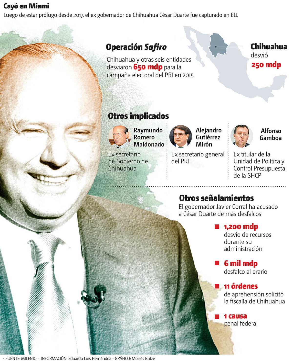 Según la fiscalía de Chihuahua, el ex mandatario chihuahuense participó en la operación Safiro, en la que junto con sus homólogos de Sonora, Colima, Durango, Estado de México y Morelos, así como con priistas de la alcaldía de Milpa Alta desviaron 650 millones de pesos para la elección de 2015 a través de 12 empresas fantasma que estaban blindadas por el Servicio de Administración Tributaria (SAT), dependiente de la Secretaría de Hacienda que encabezaba Luis Videgaray.