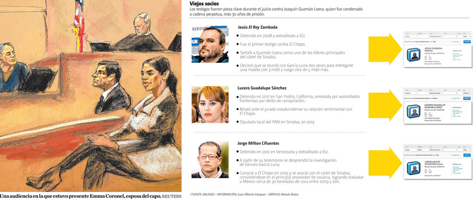 La Oficina Federal de Prisión (BOP, por sus siglas en inglés) en EU registra que los mexicanos Jesús El Rey Zambada y Lucero Guadalupe Sánchez (conocida como La Chapodiputada), así como el colombiano Jorge Milton Cifuentes, testigos protegidos en el juicio contra Joaquín El Chapo Guzmán, ya se encuentran en libertad o están a punto de obtenerla.