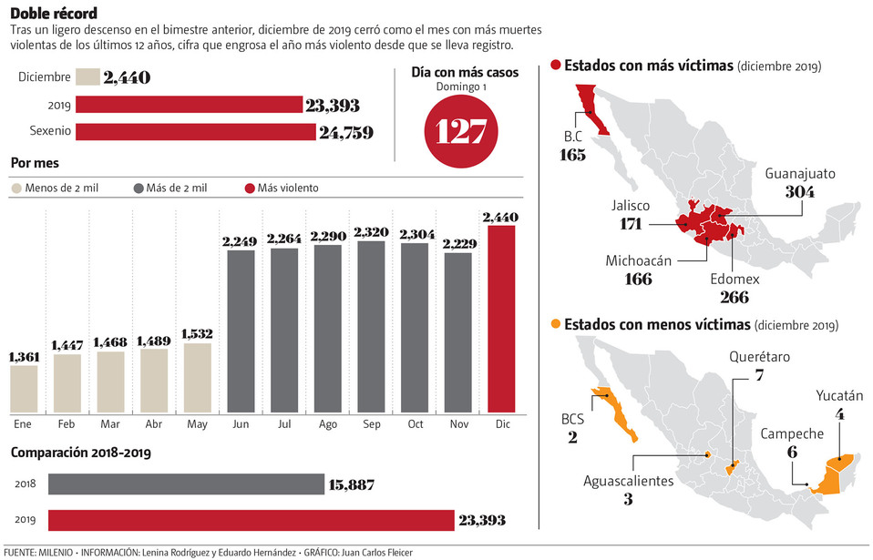 Con 2 mil 440 homicidios dolosos relacionados con el crimen organizado, diciembre se convirtió en el mes más violento de 2019, un año en el que los asesinatos se dispararon hasta los 23 mil 393 casos.
