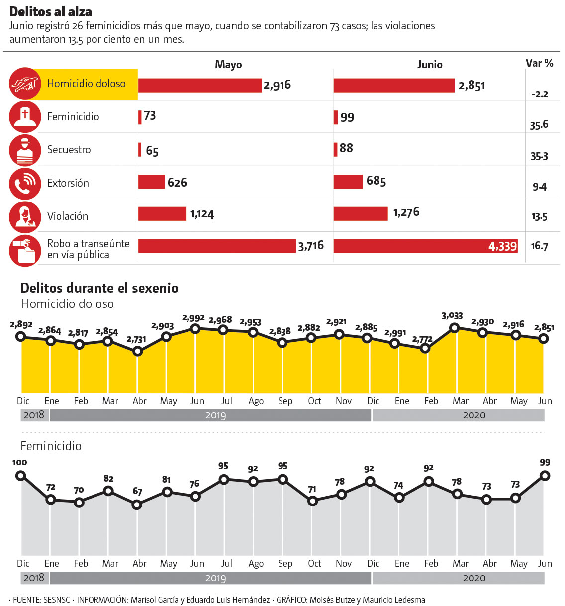 Por su parte, en la conferencia matutina, Alfonso Durazo, secretario de Seguridad y Protección Ciudadana, destacó que México registra cuatro meses de tendencia a la baja en homicidios dolosos; no obstante, admitió que los feminicidios repuntaron 7 por ciento de enero a junio.