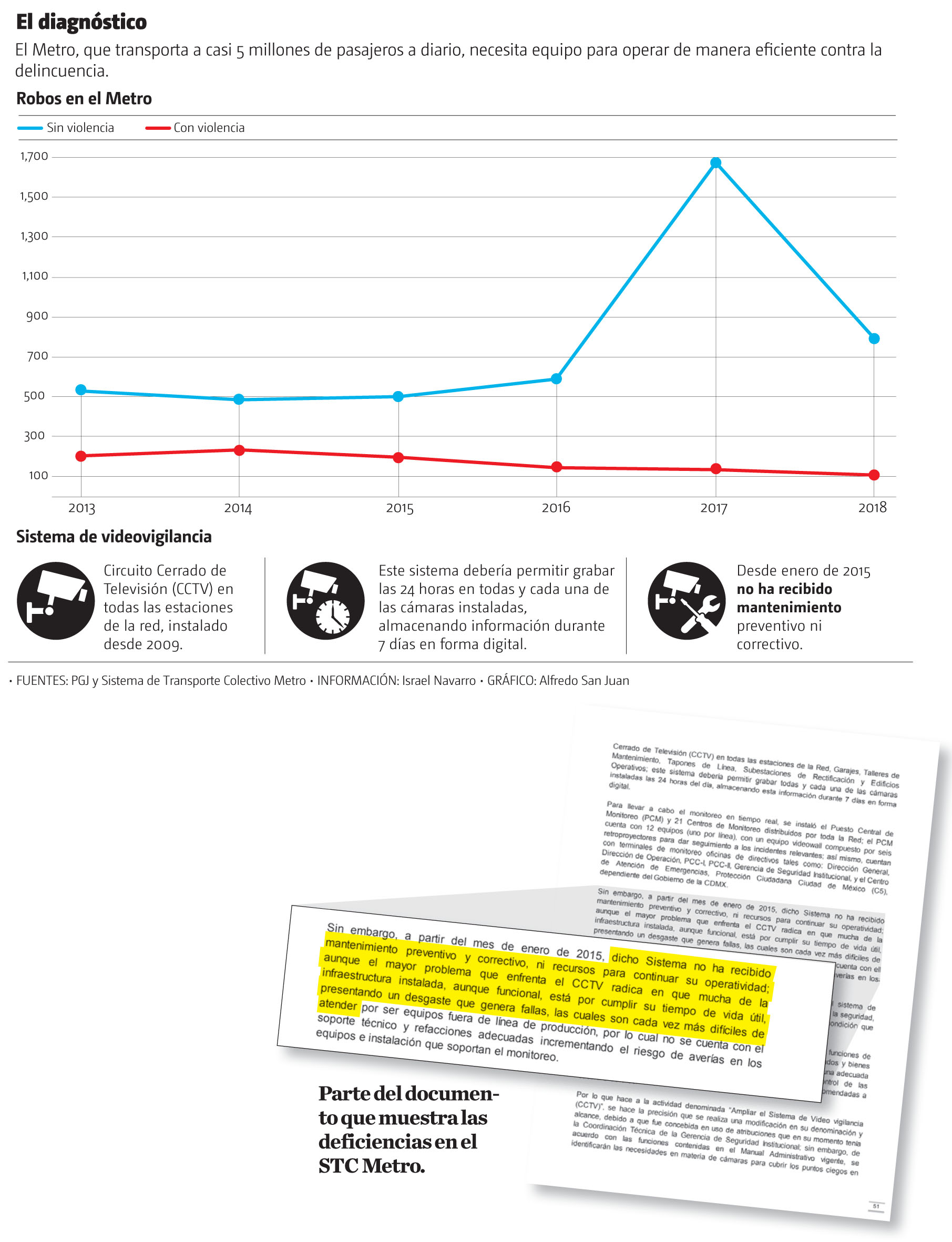 El problema se agrava, pues los 37 arcos detectores de metales “están fuera de servicio” desde 2013 y los sistemas de videovigilancia, instalados en 2015 para la seguridad de los usuarios, “no han recibido mantenimiento ni recursos para garantizar su operación; hay muchos puntos ciegos para cometer delitos”, reconoce la Dirección General, a través de Diagnóstico sobre el Servicio y las Instalaciones del Sistema de Transporte Colectivo 2013-2018.