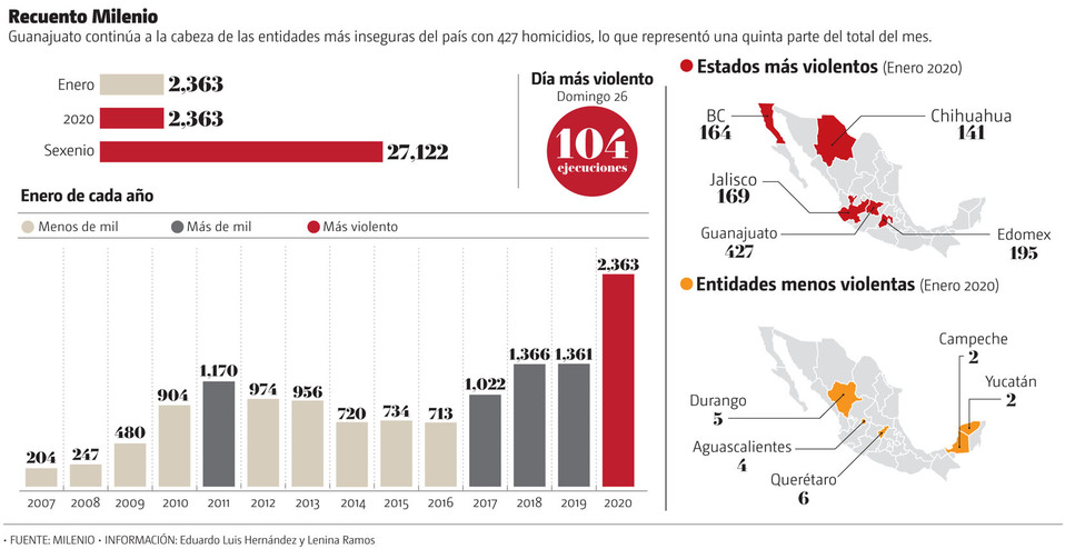 Enero cerró con 2 mil 363 homicidios relacionados al crimen organizado, una cifra menor en 3.2 por ciento a la de diciembre de 2019, cuando el recuento MILENIO registró 2 mil 440 casos.
