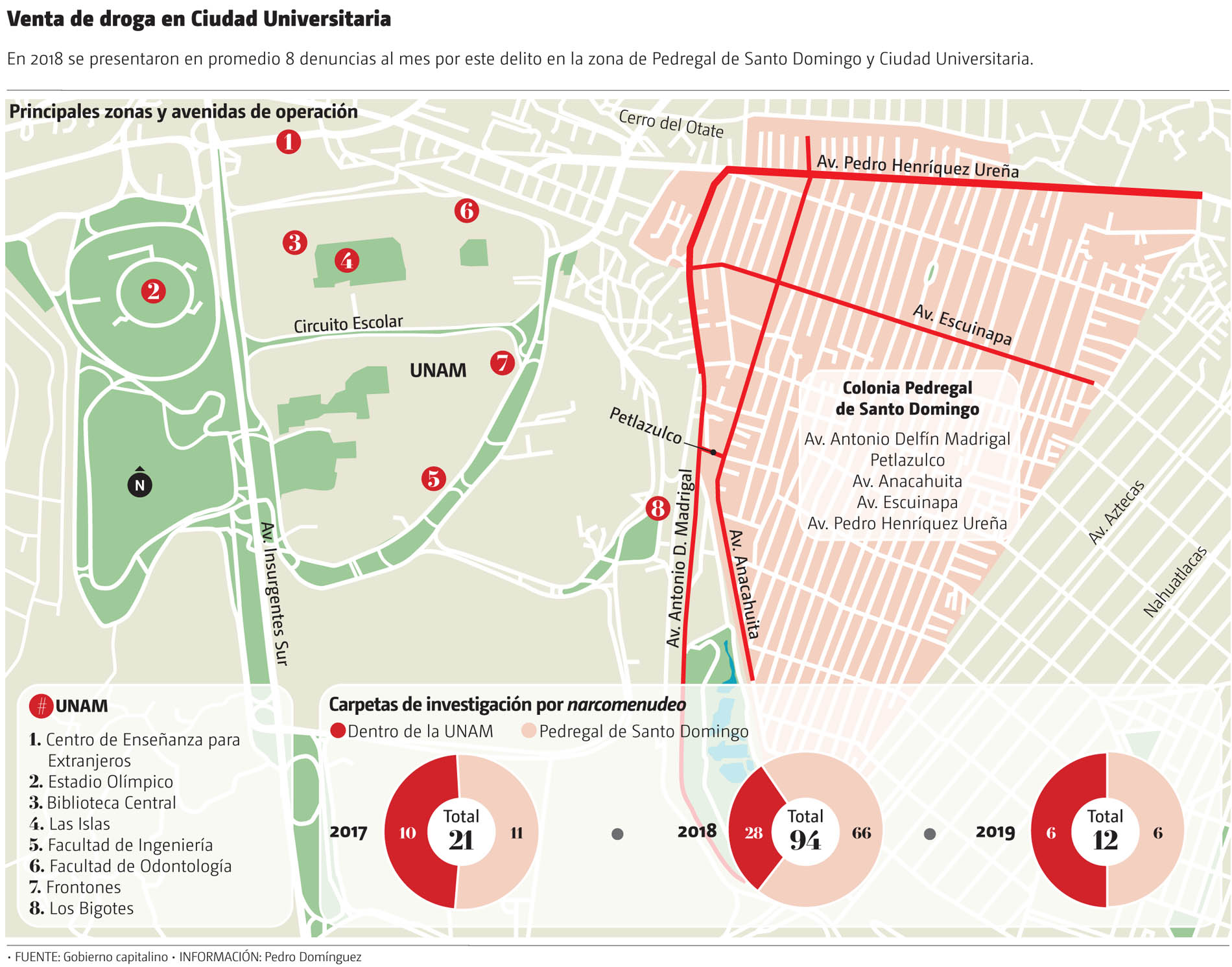 Estadísticas de la Procuraduría capitalina revelan el atlas del narcomenudeo en el campus universitario: este año la actividad se ha concentrado dentro de CU sobre avenida Universidad, en las inmediaciones del Centro de Enseñanza para Extranjeros y la Facultad de Psicología. Además, se presenta un caso en la Facultad de Derecho.