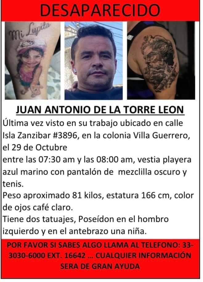Juan Antonio de la Torre fue visto por última vez sobre la calle Zanzíbar #3896. Vestía playera azul marino con pantalón de mezclilla oscuro y tenis. Tiene dos tatuajes y pesa aproximadamente 81 kilos, mide 1.66 cm y tiene color de ojos café claro.