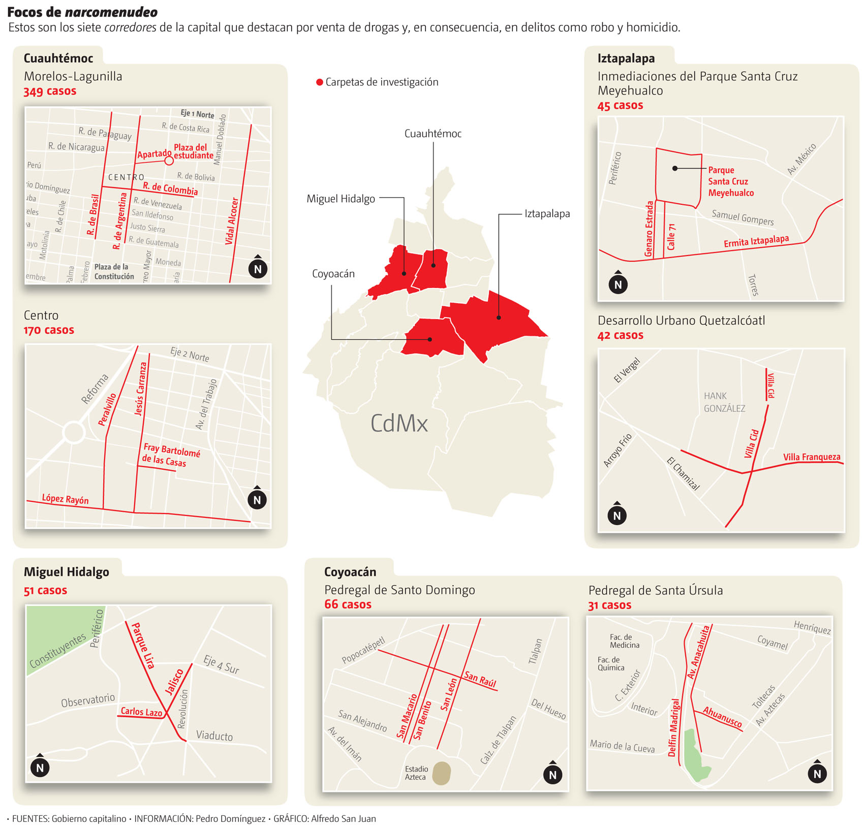 Se trata de siete arterias urbanas por donde fluye la cocaína, piedra y mariguana donde se surten los capitalinos, según consta en la base de datos abierta de la Procuraduría Capitalina.
