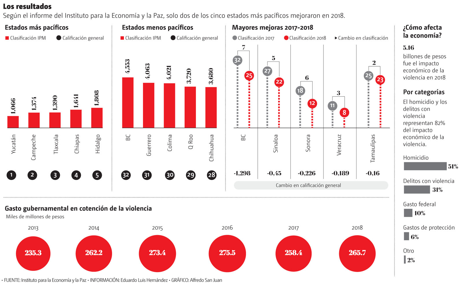 Por lo que el año pasado la paz en México tuvo un retroceso de 4.9 por ciento, con un deterioro en 22 estados y una mejora solo en 10, detalla el documento.