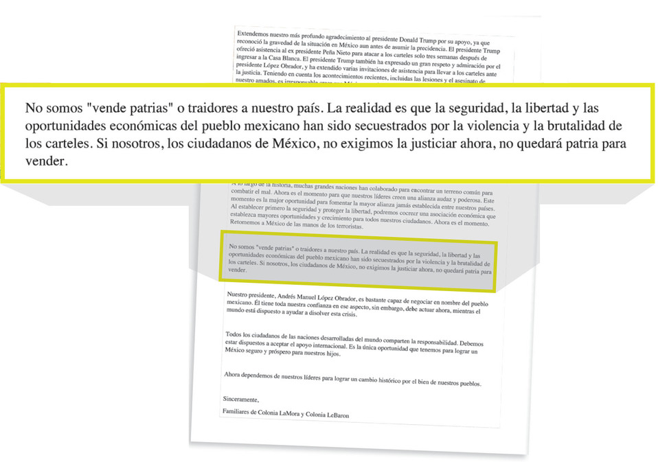 “No somos ‘vendepatrias’ o traidores a nuestro país. La realidad es que la seguridad, la libertad y las oportunidades económicas del pueblo mexicano han sido secuestrados por la violencia y la brutalidad de los cárteles.
