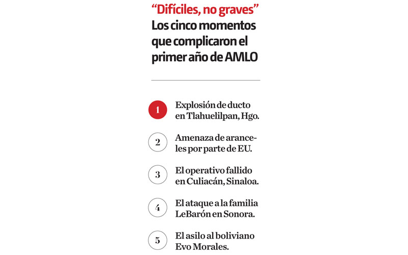 Resaltó como el problema más complicado y “más doloroso” la explosión en Tlahuelilpan, donde perdieron la vida 137 personas por la explosión de un ducto de Pemex. Continuó con la amenaza de EU de aranceles a mercancías mexicanas, el fallido operativo en Culiacán, el ataque a la familia LeBarón y el asilo al ex presidente de Bolivia Evo Morales.