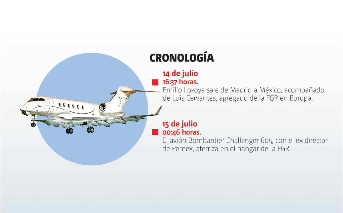 A su llegada de España, un doctor de la FGR sugirió que Lozoya tenía que ser llevado a un hospital por presentar un cuadro de “anemia desarrollada y problemas sensibles en el esófago, así como una debilidad general en toda su salud”, luego de una revisión en el hangar.
