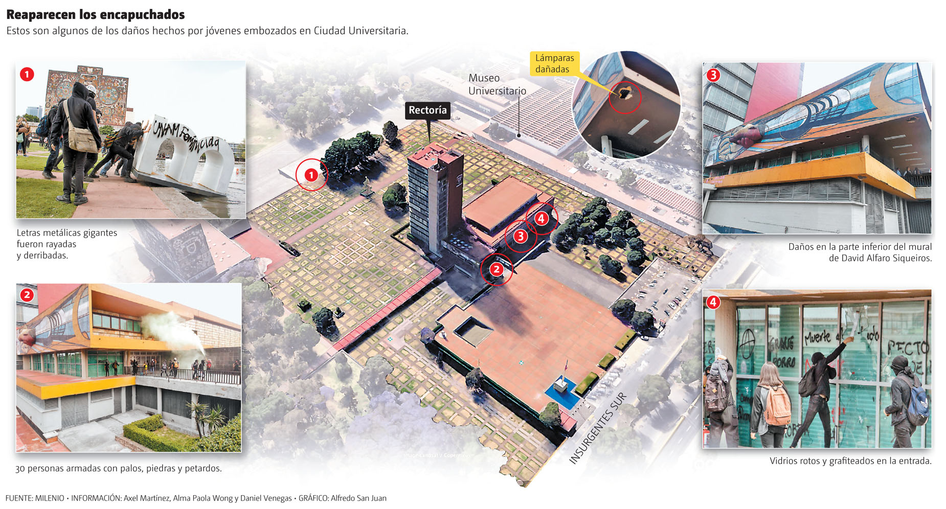Los agresores de ayer se retiraron de la azotea del edificio y se dirigieron a la zona de “Las Islas” de Ciudad Universitaria, donde vandalizaron las letras metálicas con las leyendas “#HechoEnCU” y “Autonomía 90”. Ahí, Ariana “N”, estudiante de la Faculta de Filosofía y Letras, resultó lesionada.