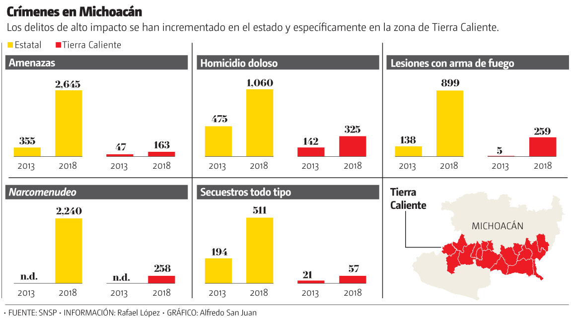 Los índices delictivos se han multiplicado entre 2013 y 2018 y están más elevados que nunca: los homicidios dolosos (pasaron de 475 a mil 60), las lesiones con arma de fuego (de 138 a 899), las amenazas (de 355 a 2 mil 645), los secuestros (de 194 a 511) y el narcomenudeo (de cero a 2 mil 240).