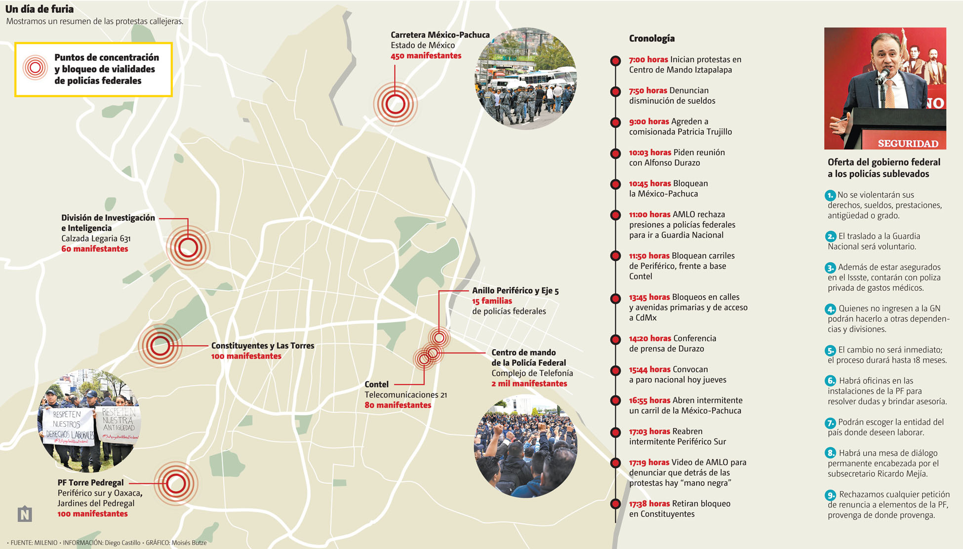 Aunque a las protestas se sumaron más policías, fue hasta las 2 de la tarde cuando Durazo dio una conferencia en la que aclaró que la transición de elementos de la PF a la Guardia Nacional es voluntaria y que respetarán salarios, prestaciones y antigüedad laboral, con estricto apego a la ley y la corporación.