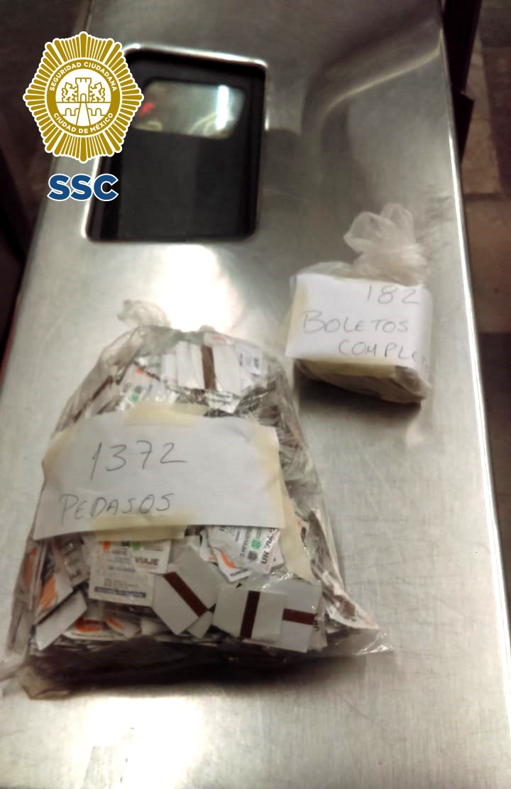 Cerca de las 01:35 horas, dos uniformados de la SSC apoyaron en el conteo del contenido de dicha bolsa, el cual arrojó: 182 boletos completos y mil 372 boletos rotos.