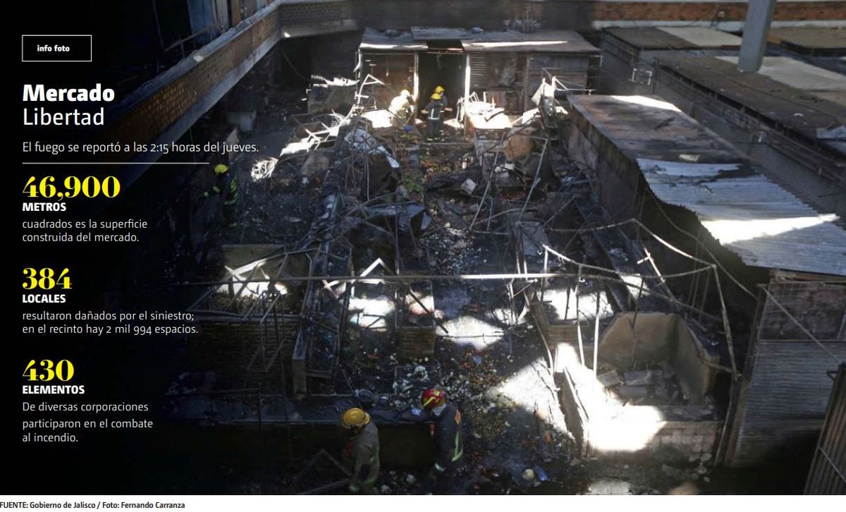 Daños en 384 locales, la mayoría con pérdida total, es el saldo del incendio en el Mercado Libertad o San Juan de Dios en Guadalajara, el cual no sufrió daño estructural, aunque permanecerá cerrado al público hasta que se haga la limpieza necesaria, y se garantice la seguridad para clientes y comerciantes.