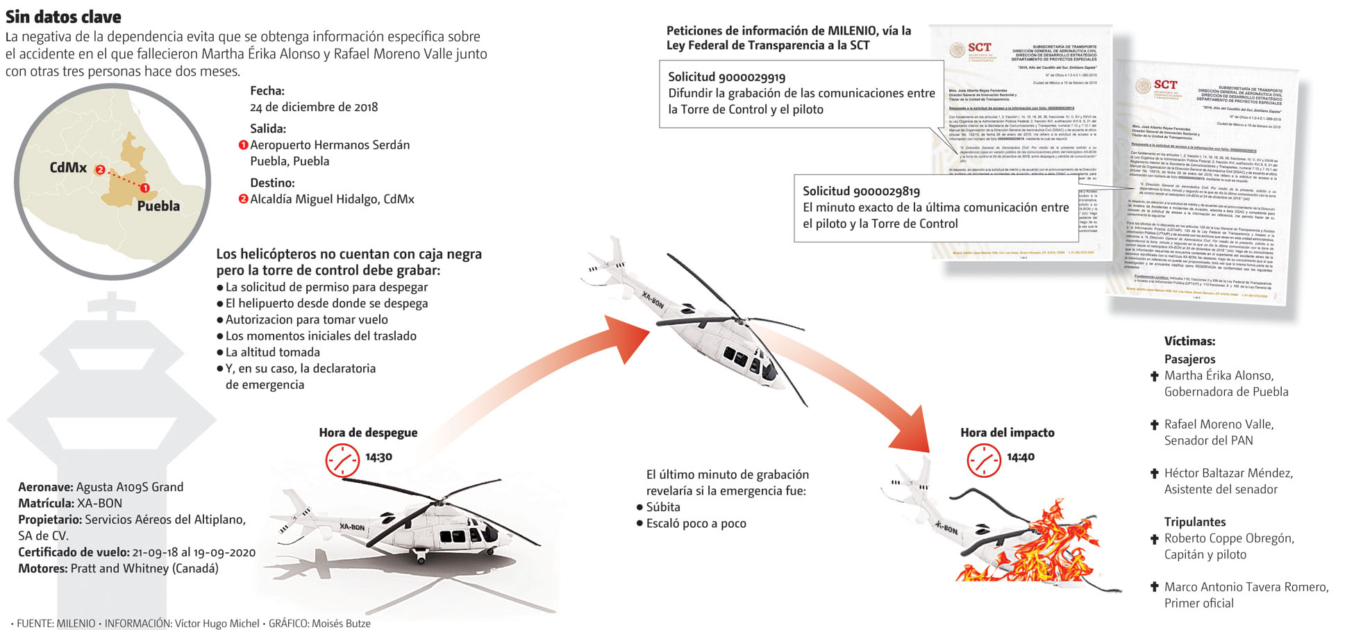 El pasado 24 de enero, al cumplirse el primer mes del accidente en el que fallecieron Alonso y Moreno Valle, MILENIO solicitó a la Comunicaciones y Transportes dos elementos: el minuto exacto entre las 14:30 y 14:40 horas en que se registró la última comunicación del helicóptero siniestrado y una versión pública de las conversaciones entre el piloto Roberto Coppe y su controlador aéreo, grabación y dato que está en los servidores de la Torre de Control del aeropuerto Hermanos Serdán en Puebla. Si bien la aeronave no contaba con caja negra, las comunicaciones sobre entradas y salidas de un helicóptero deben grabarse en la torre.
